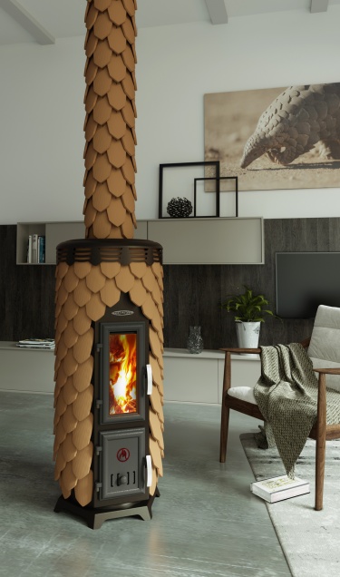 Обожженная глина, она же терракотовая керамика, известна с древности. И является, возможно, первым в истории человечества искусственным материалом, который до сих пор считается лучшим для изготовления печей. А одно из самых древних и удивительных творений природы - это чешуя. Рыбы, ящеры, птицы, змеи, самые разнообразные животные и растения имеют это совершенное и красивое облачение. Посмотрите, например, на панголина. Этот доисторический зверь, похожий на огромную живую еловую шишку, и каким-то чудом застрявший в спирали времени, вдохновил нас на создание облицовки для металлических печей. Мы скрестили ежа с ужом древнейший рукотворный материал с нерукотворным чудом природы, сделав чешую панголина из терракоты. И покрыли ей печь. Похоже, мы первыми до этого додумались.